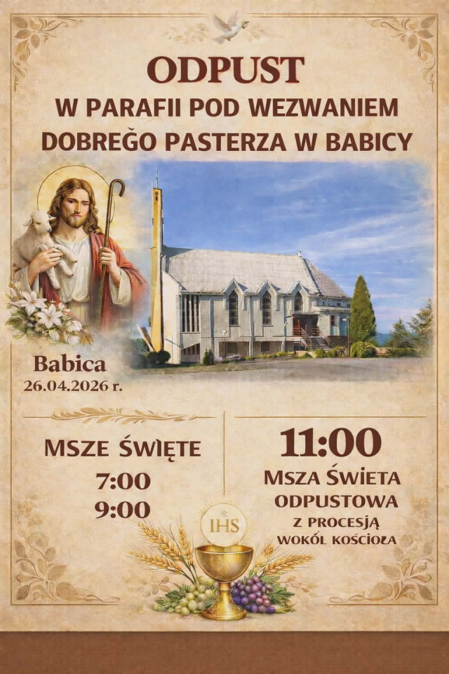 7 W najbliższą Niedzielę – 26 kwietnia - w naszej parafii w będziemy przeżywać UROCZYSTOŚĆ ODPUSTOWĄ KU CZCI PANA JEZUSA – DOBREGO PASTERZA. Na sumę serdecznie zapraszam STRAŻAKÓW w mundurach galowych i Pocztem Sztandarowym. Proszę, aby w czasie procesji strażacy wzięli: Krzyż oraz figurę Pana Jezusa Zmartwychwstałego. Na sumę serdecznie zapraszam uczniów naszej Szkoły Podstawowej z Pocztem Sztandarowym. Proszę aby Róże pań: JADWIGI PAPCIAK, DANUTY SZURLEJ, GRAŻYNY WÓJCIK, wzięły obrazy i figury. Proszę aby Róża pań: MARII RATAJ wzięły świece. Proszę aby Róże panów MARIANA PSZONKI i CZESŁAWA WÓJCIKA wzięły baldachim oraz sztandary.